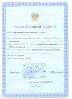 Букмекерская контора «Гол+Пас» получила Государственную лицензию на осуществление деятельности в сфере игорного бизнеса "Тотализатор" за номером 0000010.