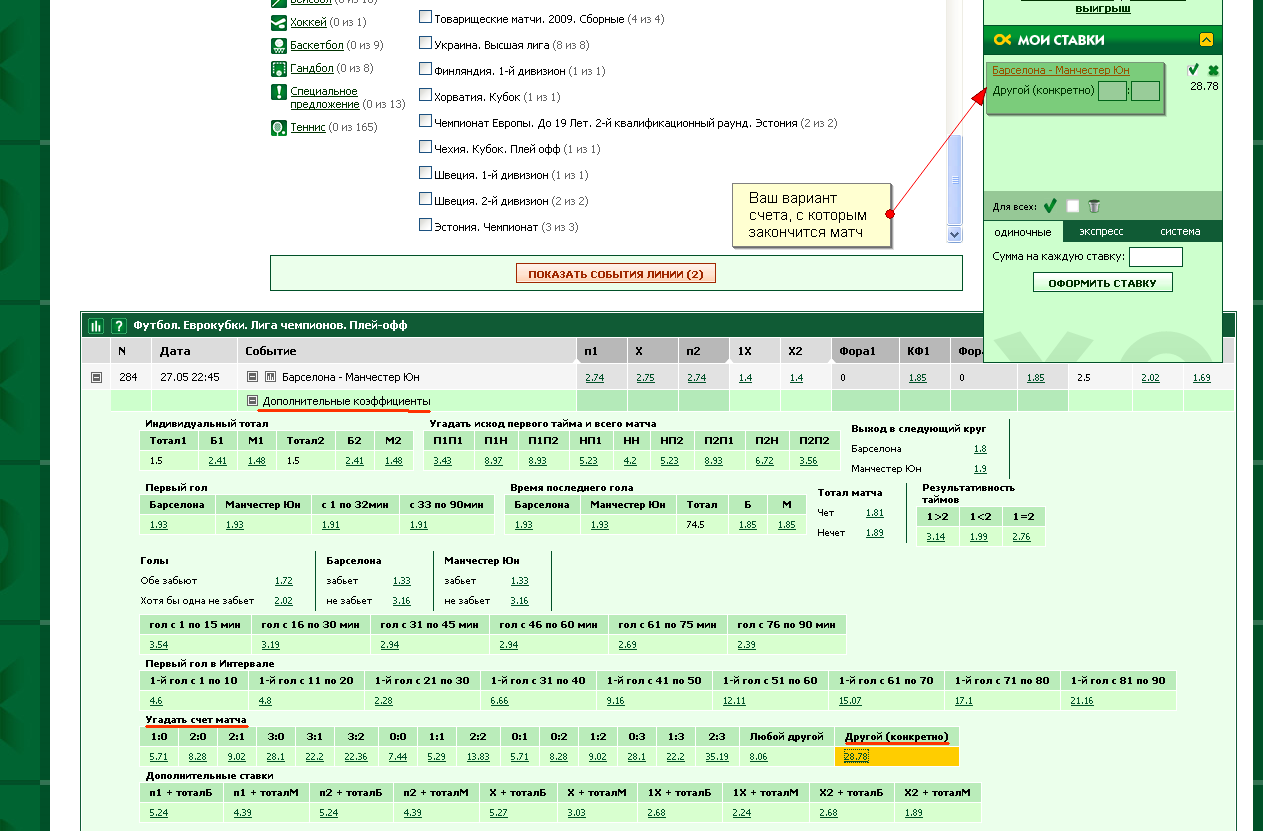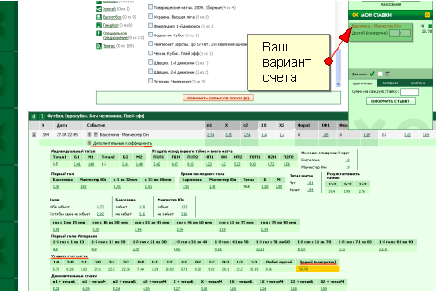 В линии представлены различные варианты счета, с которым может закончиться матч. Если вы считаете, что данный матч закончится со счетом, не указанным в линии, то вы можете сделать ставку «Любой другой» или «Другой конкретно». Выбрав ставку «Другой конкретно», вам необходимо указать, с каким именно счетом закончится матч в поле «Мои ставки».